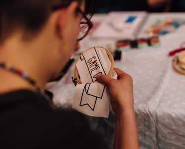 Je propose des ateliers de broderie et d'upcycling pour des participants de différents niveaux, que tu aies ou pas déjà touché des aiguilles, nous passerons un bon moment ensemble et redonnerons vies à des textiles oubliés au fond de ton placard.